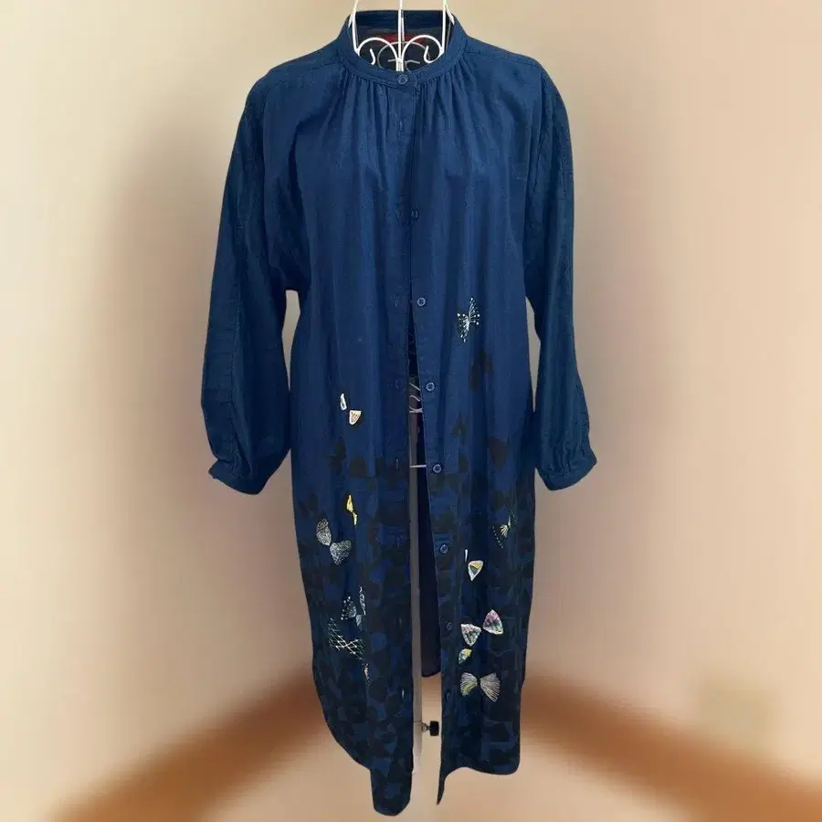 다크 블루 색상의 코튼 소재, 나비 자수가 놓인 버튼 업 원피스입니다. 한 번 착용한 후 손세탁하여 자택 보관 중이었습니다. 매우 마음에 들어 구매했지만, 입는 옷의 스타일이 바뀌어 착용할 기회가 없습니다. 애용해 주실 분께 양도하고 싶습니다.