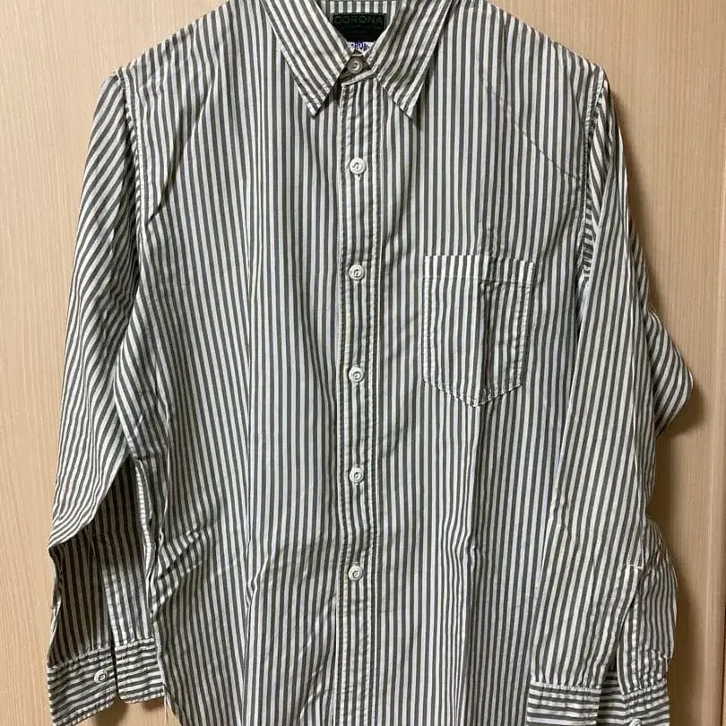자동 번역되었어요. 원문보기카키와 화이트 스트라이프 디자인의 코튼 셔츠.
