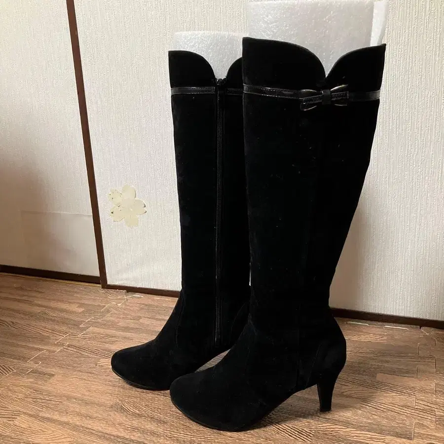 M 사이즈 23~23.5cm 스웨이드 소재의 블랙 롱 부츠, 지퍼와 리본 장식이 있습니다. - 색상: 블랙 - 소재: 스웨이드 - 굽 높이: 약 3cm - 디자인: 지퍼, 리본 장식 - 스타일: 롱 부츠 - 타입: 힐 부츠 방문해 주셔서 감사합니다. 컬러 - 블랙 계열