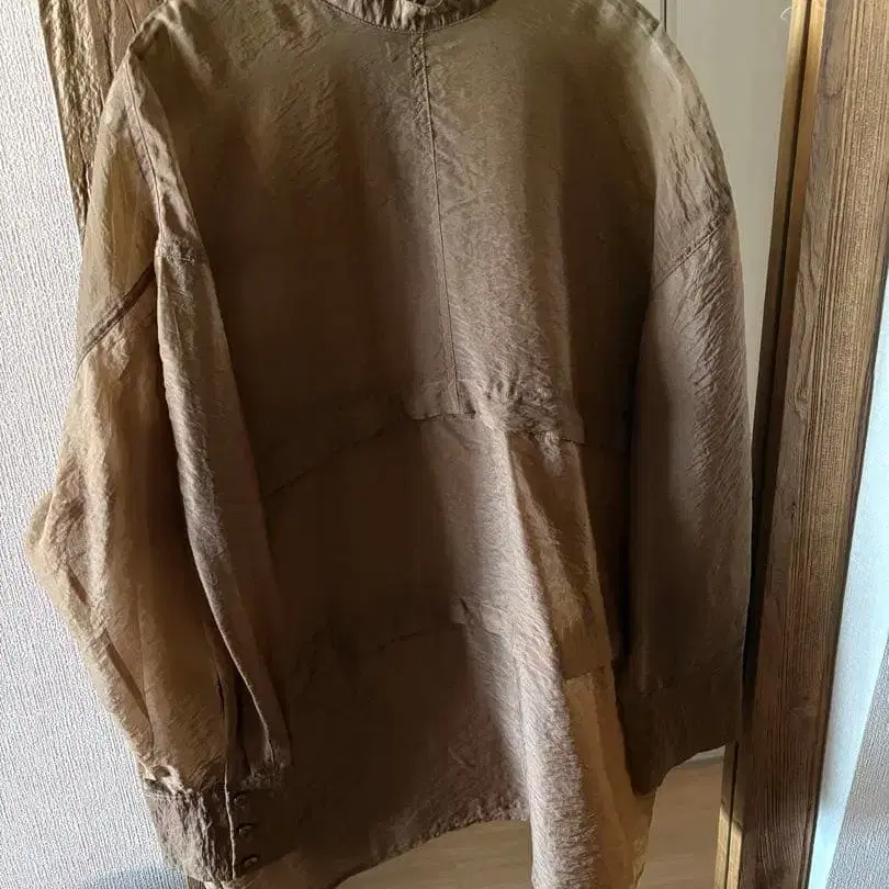 긴팔이며, 소매에는 버튼이 달려 있어 심플하면서도 세련된 인상을 줍니다.