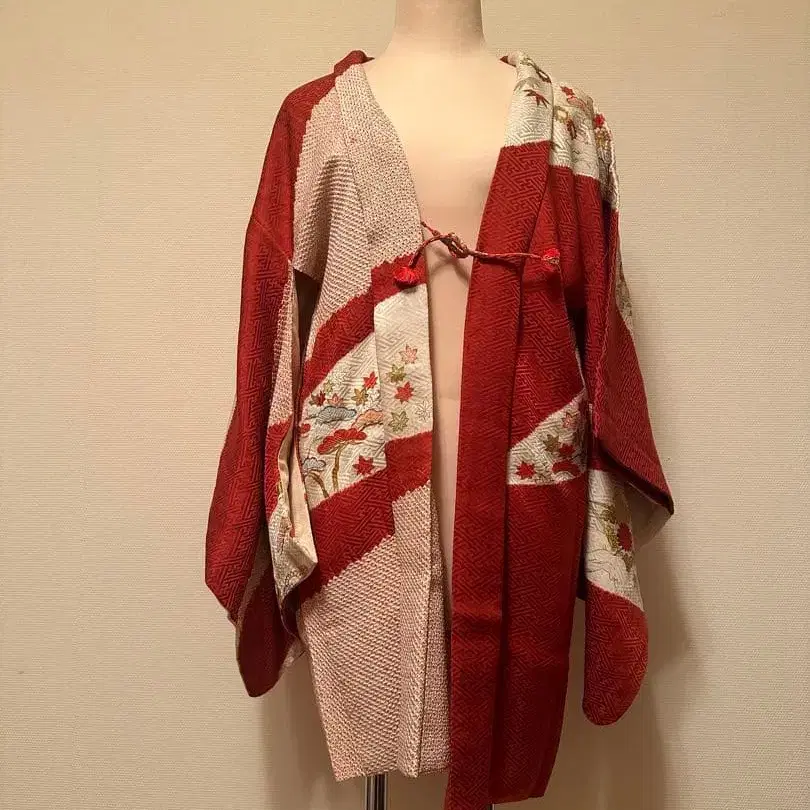빨간색과 화이트 스트라이프에 단풍과 꽃 자수가 들어간 겉옷. - 색상: 빨간색과 화이트 스트라이프 - 디자인: 단풍과 꽃 자수 - 스타일: 겉옷 - 소재: 짜임 무늬 원단 방문해 주셔서 감사합니다.