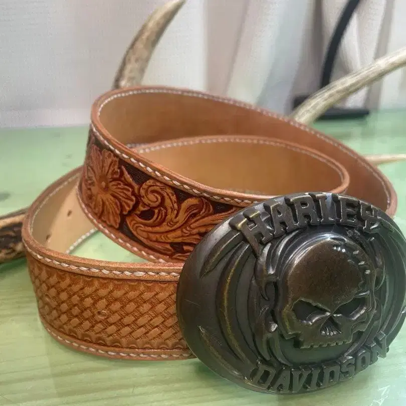 할리데이비슨 버클이 눈길을 사로잡습니다.