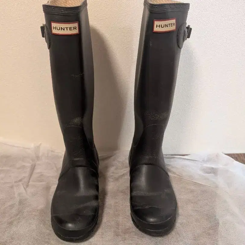 고무 소재의 블랙 롱 부츠, 버클이 있어 스타일리시합니다.