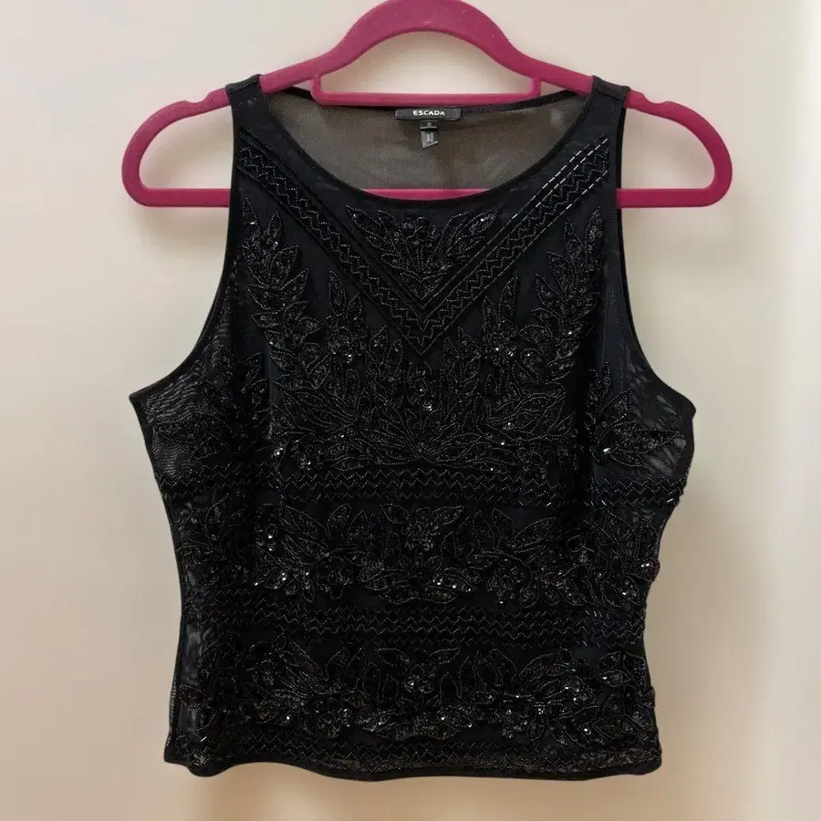 비즈 자수가 놓인 블랙 시스루 슬리브리스 상의. 매우 고져스하고 품격이 있습니다. 소중히 보관하고 있었으나 판매합니다. - 브랜드: ESCADA - 사이즈: S - 색상: 블랙 - 디자인: 비즈 자수 - 스타일: 슬리브리스 방문해 주셔서 감사합니다. 사이즈 - S