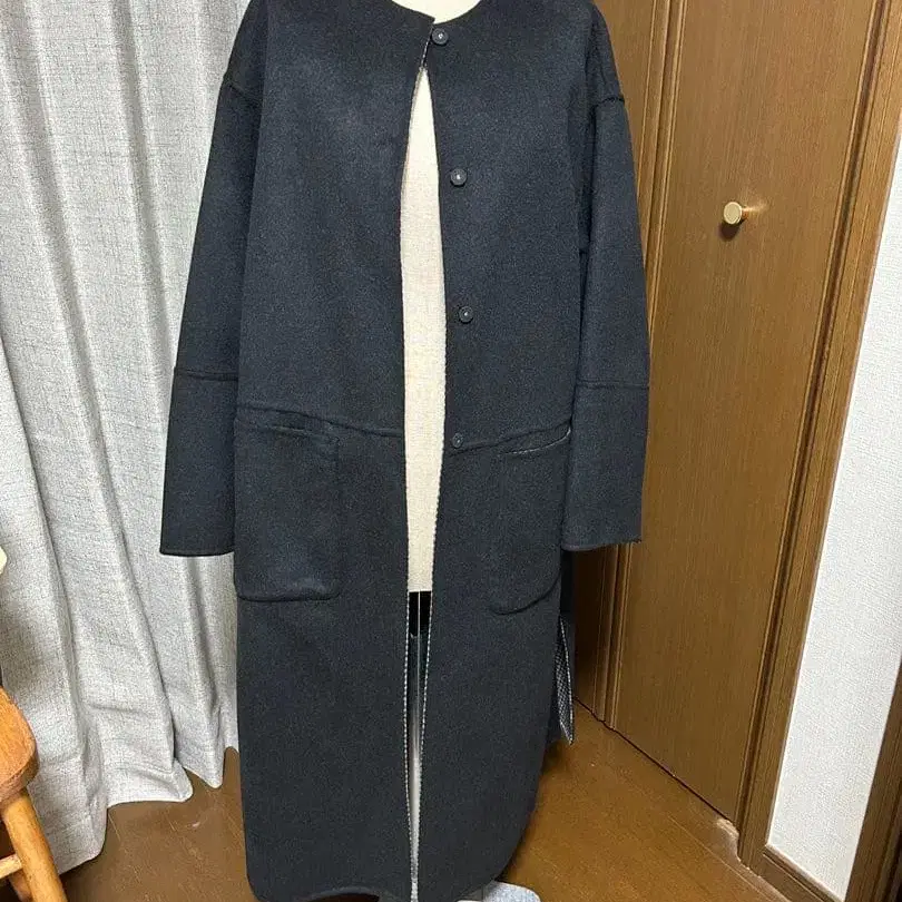 베이크루즈 리버서블 디자인 롱 코트, 블랙과 체크 무늬.