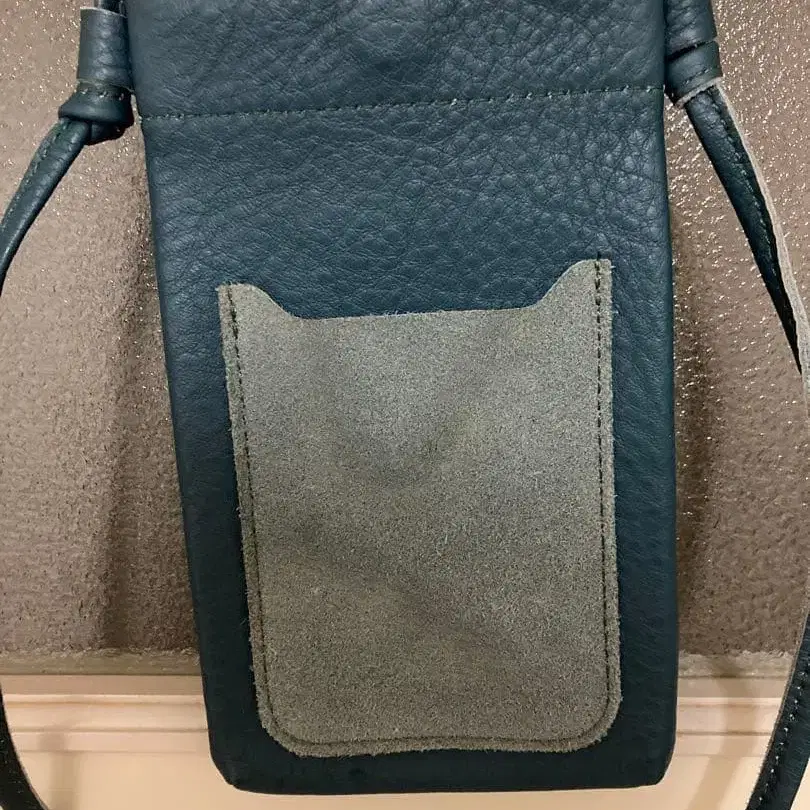 다크 그린 소가죽 스마트폰 숄더백, 스웨이드 포켓으로 스타일리시합니다.