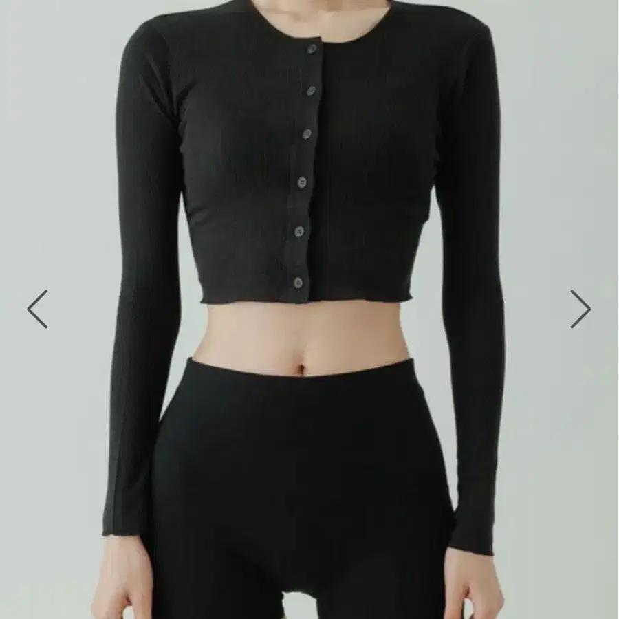 크롭 기장의 크루넥 디자인 가디건은 신체에 적당히 맞는 사이즈감입니다.