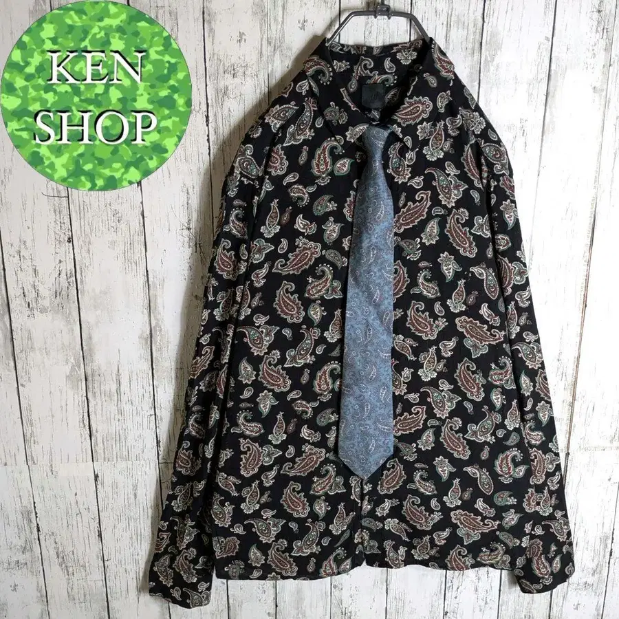 • [넥타이 셔츠] 구제 의류 빅 사이즈 페이즐리 그린 다크 그레이 레트로