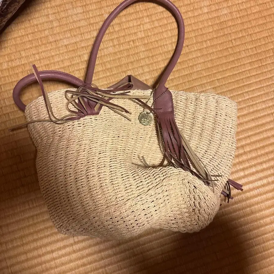 베이지 색상의 스트로우 소재에 보라색 핸들, 프린지 장식이 달린 바스켓백입니다. - 색상: 베이지 - 소재: 스트로우와 가죽 - 디자인: 프린지 장식 - 안쪽 소재: 원단 - 핸들 색상: 보라색 방문해 주셔서 감사합니다.