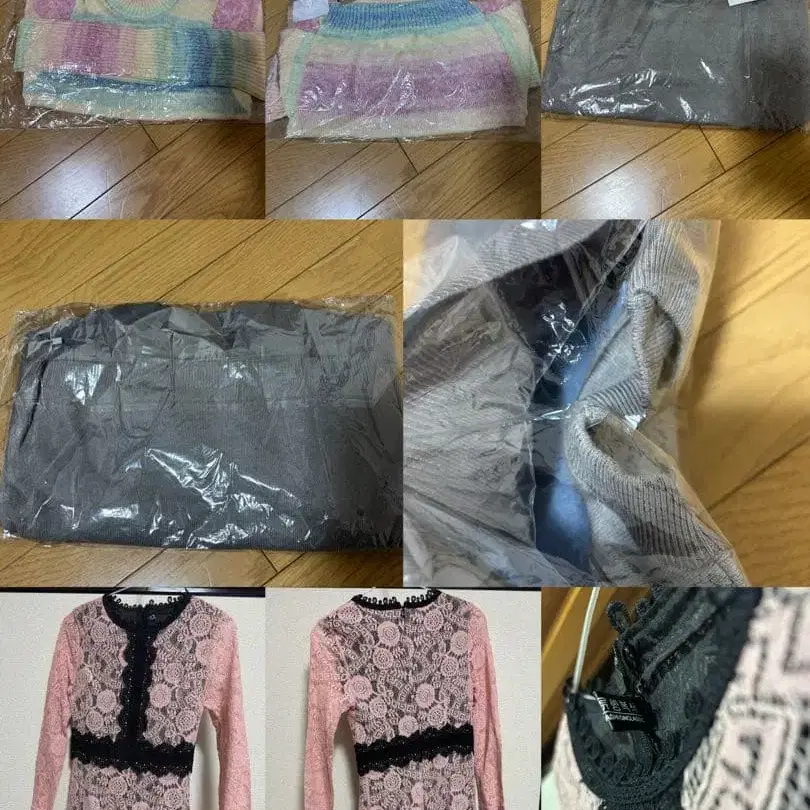 3개 묶음 판매입니다. clear 레인보우 반팔 니트 암커버 포함 미사용 새상품 clear 그레이 긴팔 (소매가 파랑 배색입니다.) 니트 미사용 새상품 한국 레이스 원피스