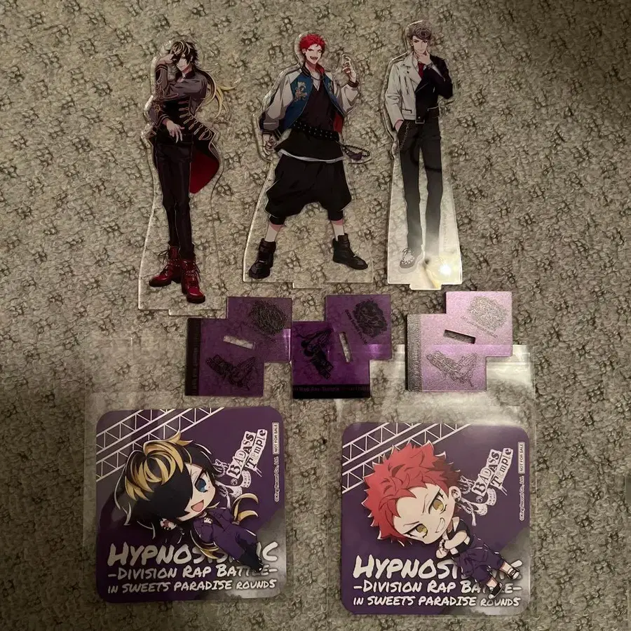 히프노시스 마이크의 하라이 쿠코, 시지미 쥬시, 텐고쿠 고쿠 아크릴 스탠드와 코스터 세트입니다. 아크릴 스탠드는 애니메이트에서 구매한 것입니다.