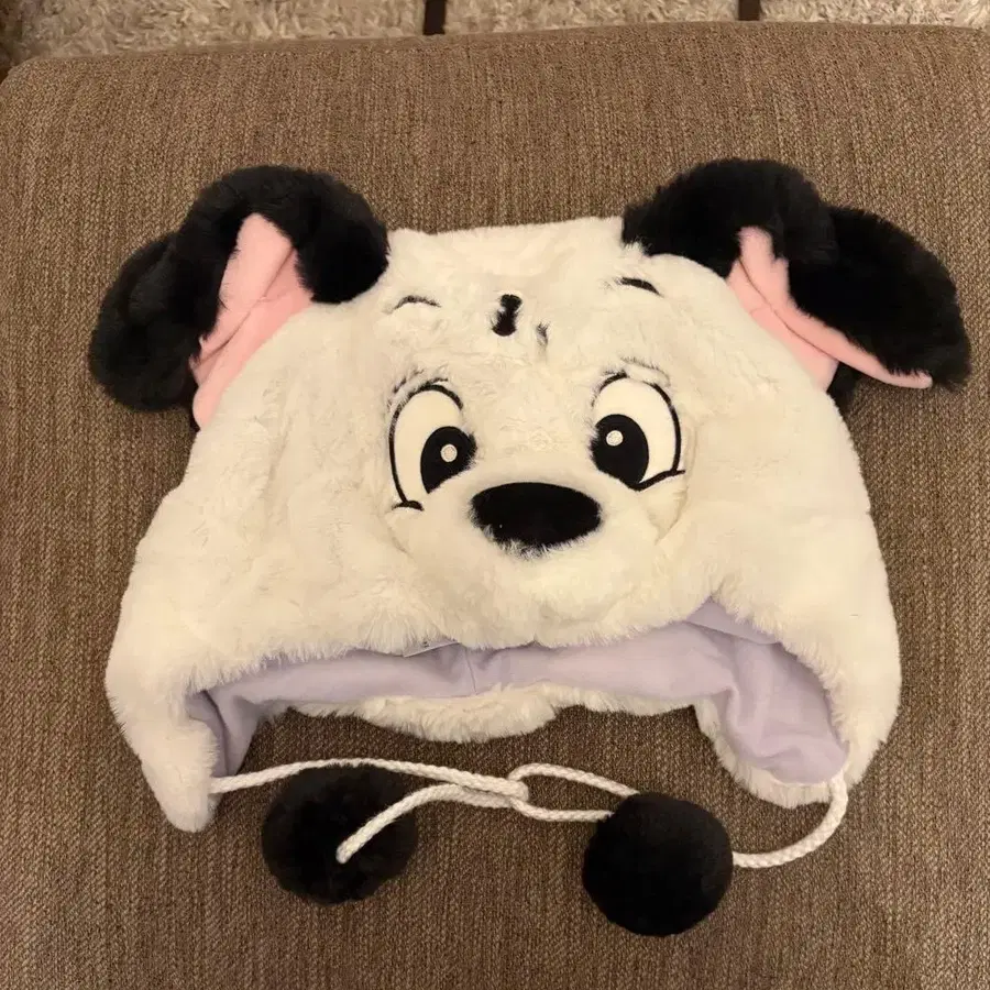 강아지 캐릭터를 본뜬 플리스 소재의 후드, 귀와 폼폼이 달린 귀여운 디자인. - 디자인: 강아지 캐릭터 후드 - 색상: 화이트와 블랙 - 소재: 플리스 - 특징: 귀 포함, 폼폼 포함 끈 - 안감: 보라색 방문해 주셔서 감사합니다.