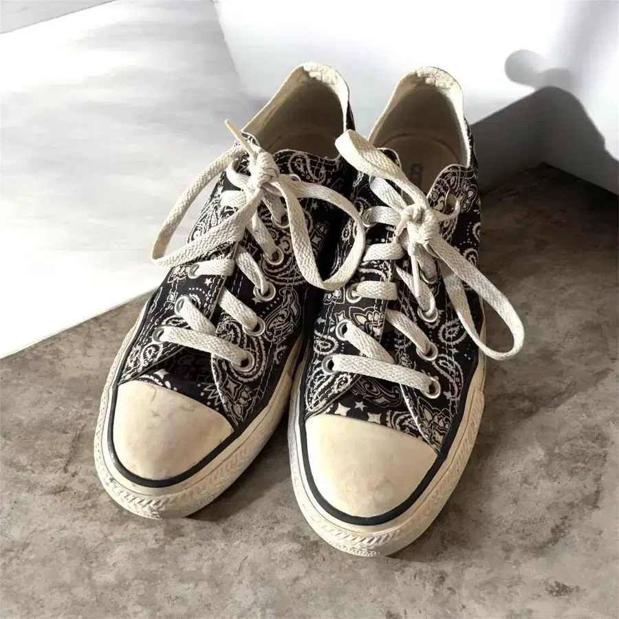 반다나 패턴의 검은색 스니커즈, ALL STAR 디자인.