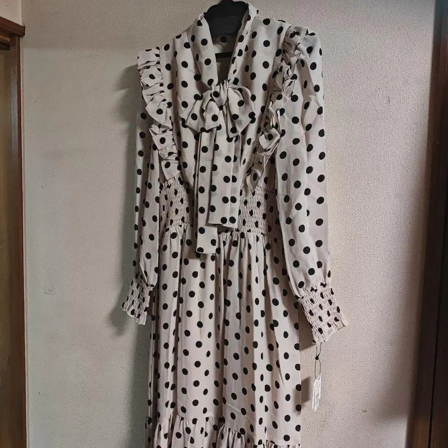야마다야 FENNEL - 디자인: 물방울 패턴 - 색상: 베이지 - 소매 스타일: 긴팔 - 옷깃: 프릴이 달린 옷깃 - 허리: 셔링 허리 - 밑단 스타일: 프릴 밑단 - 기타 특징: 리본이 달린 목 부분 정가 26000 보낼 때는 작게 접어서 보내드립니다.