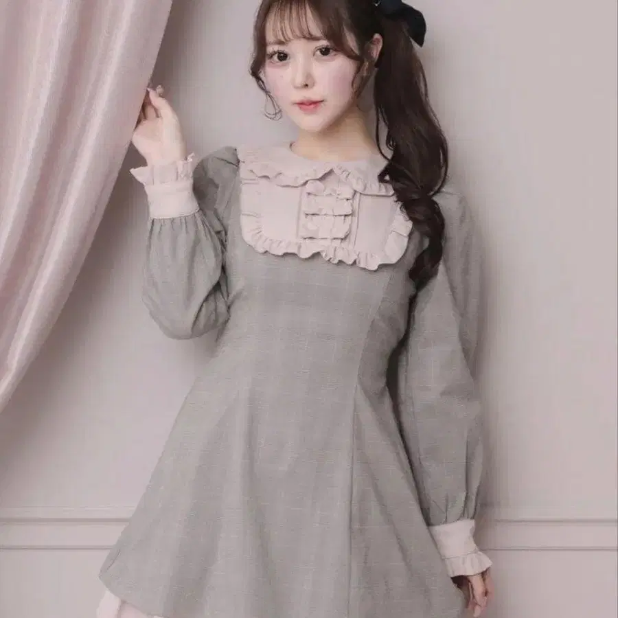 pium 그레이 카라 부착 리본 긴팔 원피스