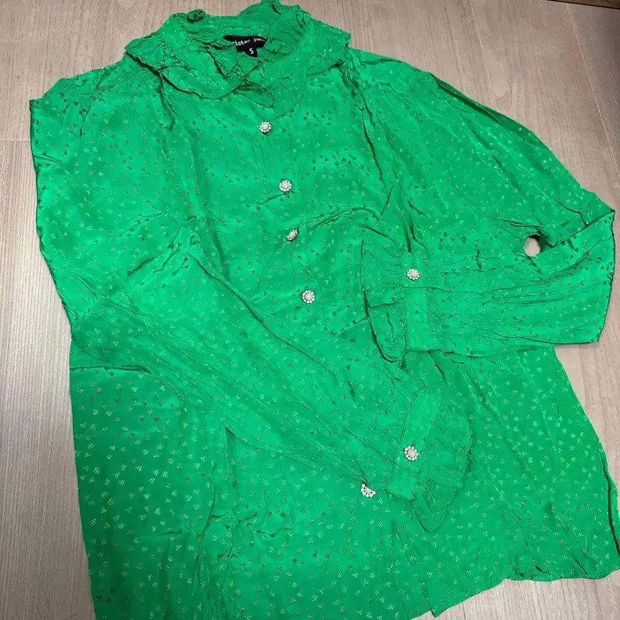 프릴과 비쥬가 특징인 그린 셔츠. 무늬는 하트 모양입니다. 보관 시 생긴 구김으로 잘 보이지 않지만, 실루엣이 예쁘고 목 부분의 프릴과 버튼의 비쥬가 아름답습니다. 실크와 같은 소재감으로 원피스나 튜닉, 뷔스티에와 함께 착용도 가능합니다. - 브랜드: Sister Jane - 사이즈: S - 색상: 그린 - 디자인: 프릴 달린 버튼 셔츠 - 장식: 비쥬 달린 버튼 방문해 주셔서 감사합니다. 사이즈 - S