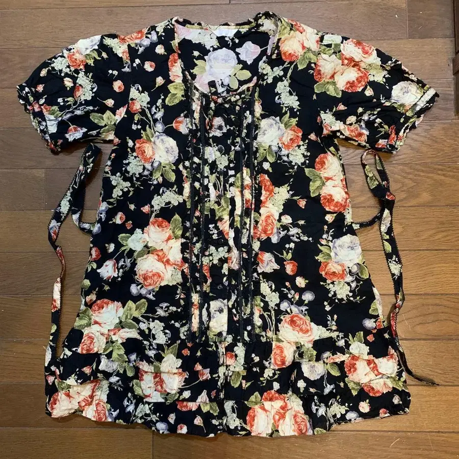 블랙 베이스에 꽃무늬가 있는 반팔 튜닉, PINE HOUSE 제조.