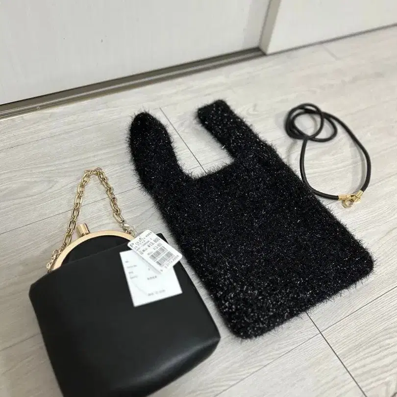 여러 가지 방법으로 즐길 수 있는 백 세트입니다. 가마구치 미니 백을 체인 스트랩으로 메면 화려하게, 블랙 니트 백에 이너 백으로, 스트랩을 바꿔 달면 숄더백이 됩니다. 13,800엔