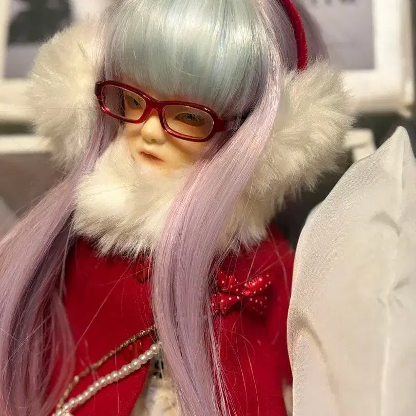 스카이블루와 보라색의 그라데이션 머리카락, 빨간색 케이프와 화이트 드레스 인형 샤토 벨라 - 머리 색깔: 스카이블루와 보라색의 그라데이션 - 복장: 빨간색 케이프와 화이트 드레스 - 액세서리: 빨간색 안경과 퍼 귀도리 - 상태: 오리지널 박스 포함 - 부속품: 펄 목걸이 방문해 주셔서 감사합니다.