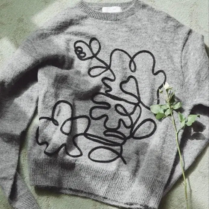 꽃무늬 자수 그레이 니트 스웨터 긴팔