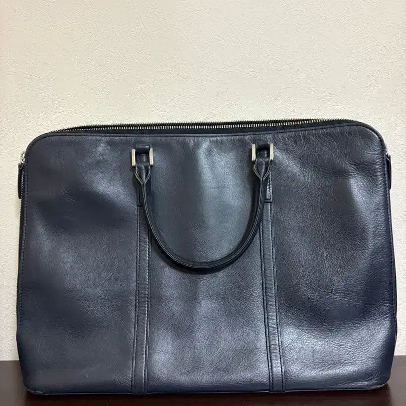 심플한 디자인의 파란색 가죽 비즈니스 백.