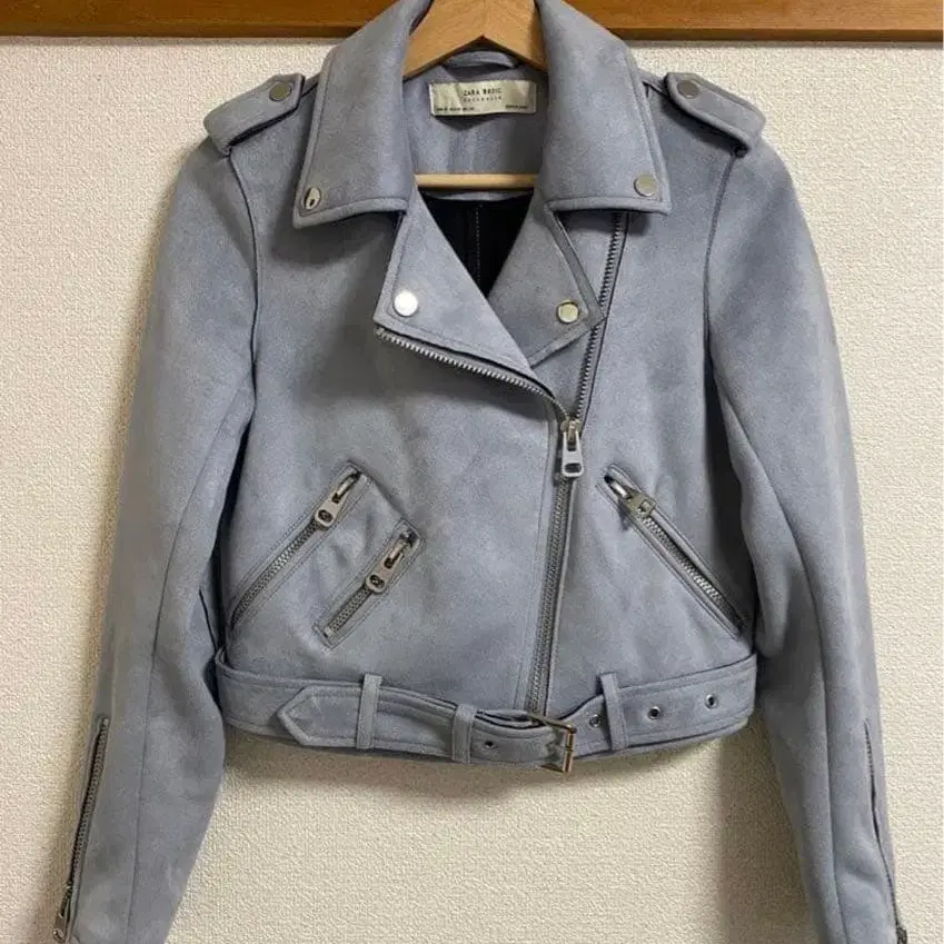 스카이블루 색상의 라이더 자켓입니다. 약 1년간 사용 스카이블루, 블루, 자켓, 라이더 자켓, 겉옷, 가죽 자켓, 벨트, 여성용, 탁한 그레이