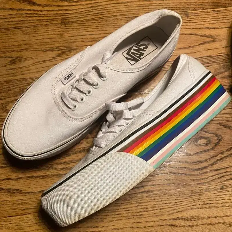 레인보우 통굽입니다. 정말 귀여운데 다른 반스를 신어버려서 신을 기회가 거의 없었고, 두 번 정도 동네에서 신고 보관하고 있었습니다. 찾으시는 분께
