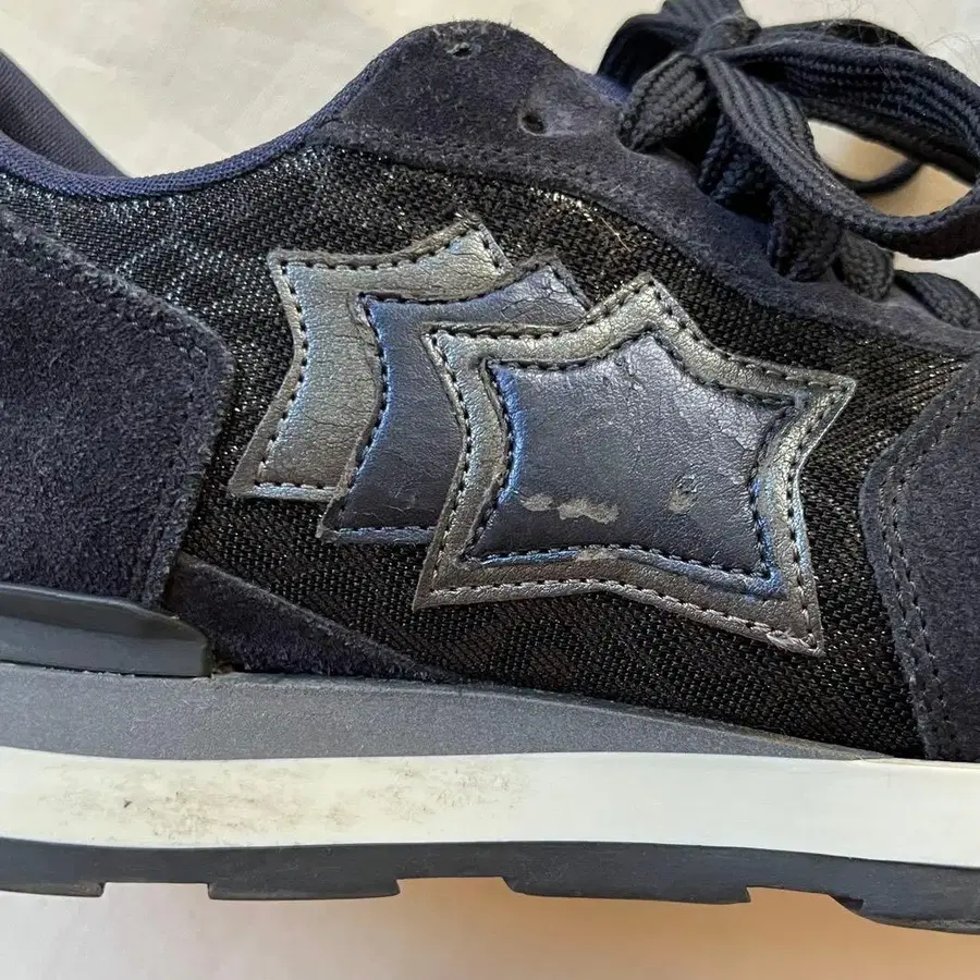 네이비 색상의 스웨이드와 메쉬 소재 스니커즈, 별 모양 로고