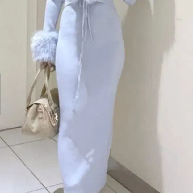 리엔다 퍼 포함 라이트 그레이 긴팔 니트 원피스