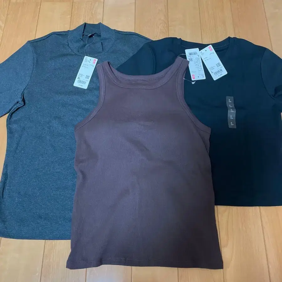 UNIQLO 유니클로 미사용 새상품 택 포함 3개 세트 5부 기장 하이넥 → XL 다크 그레이 1,500 미니 T → L 블랙 1,500 리브 브라탑 → L 브라운 2,980 구매 이후 봉투에 넣어 보관했습니다. 약간의 접힌 주름이 있을 수 있는 점 이해 부탁드립니다.