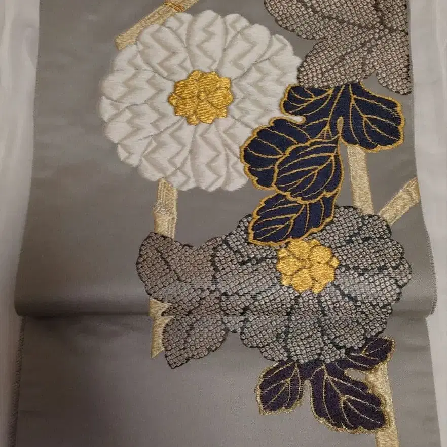 그레이 색상 바탕에 대나무 울타리와 큰 국화 문양이 들어간 당직 후쿠로 오비입니다.