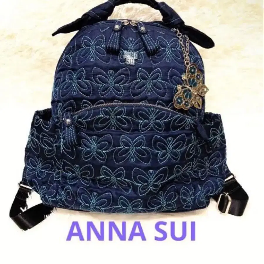 새상품급 안나수이 백팩 자수 올 패턴 로고 플레이트 블루
