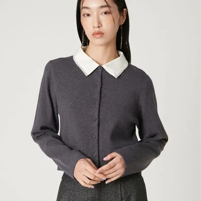 크루넥 가디건에 펄과 비즈로 트리밍한 실키한 탈착식 옷깃을 세트로 구성했습니다.
