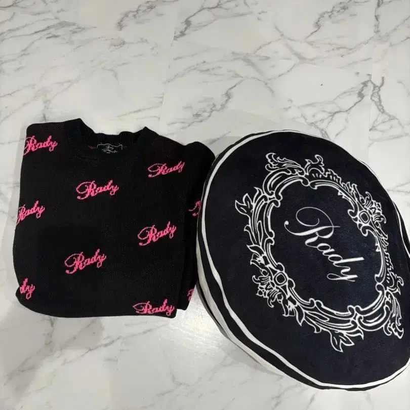 로고가 특징인 Rady의 블랙 니트. - 브랜드: Rady - 색상: 블랙 - 디자인: 로고 - 소재: 니트 쿠션도 함께 보내드립니다. 방문해 주셔서 감사합니다.