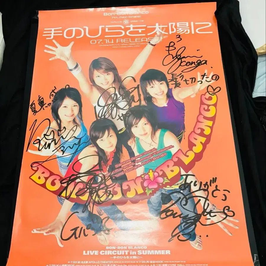 자동 번역되었어요. 원문보기멤버의 사인 포함된 BON-BON BLANCO의 컬러풀한 포스터.