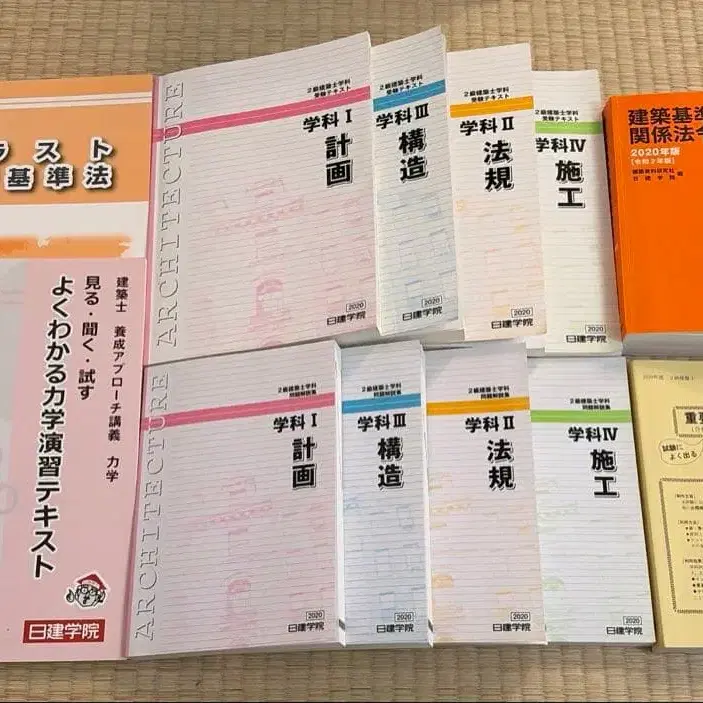 닛켄학원 2급 건축사 시험 대책 텍스트 세트 2021 계획 법규 구조 시공 방문해 주셔서 감사합니다. 2급 건축사 시험 수험 시 사용했습니다. 통학 시 사용했기 때문에 필기나 접힘, 꺾임 등이 있습니다. 또한, 성명 기재했던 부분은 잘라냈습니다. 6