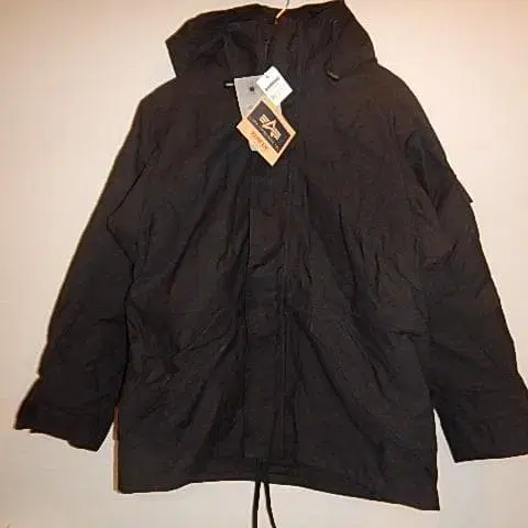 탈부착 가능한 플리스 소재 라이너와 드로 코드(조임끈)가 달린 블랙 밀리터리 자켓.