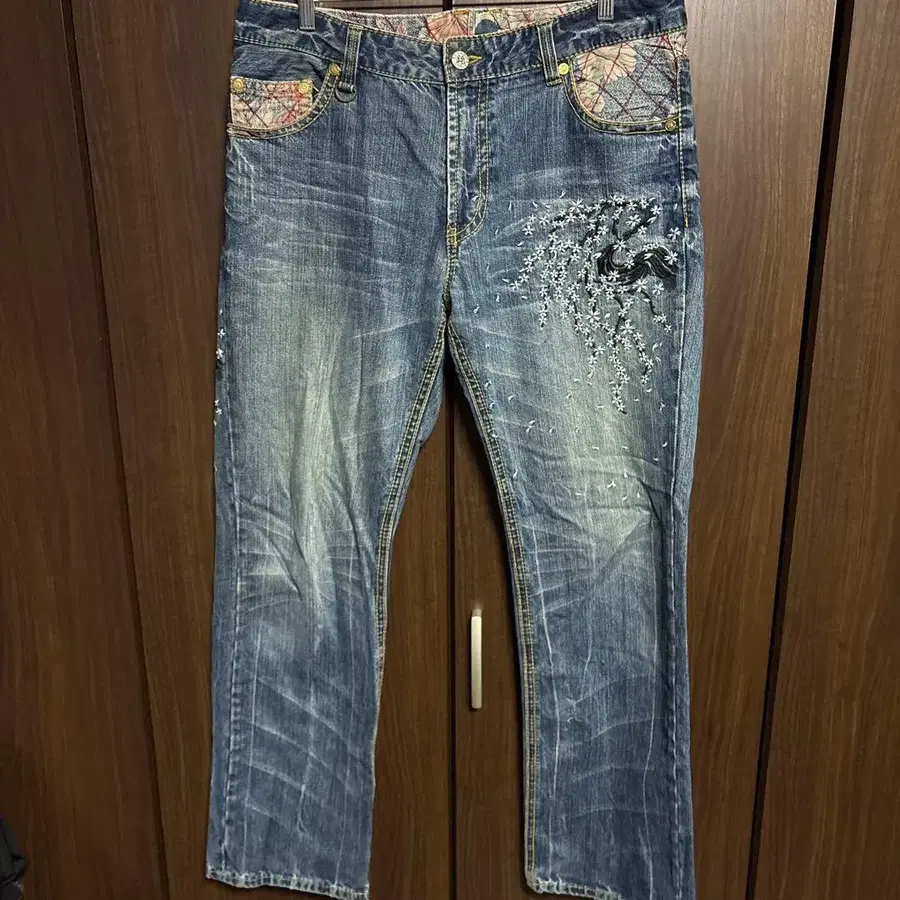 카라쿠리타마시 데님 팬츠 청바지 자수 일본풍 패턴 빅 사이즈
