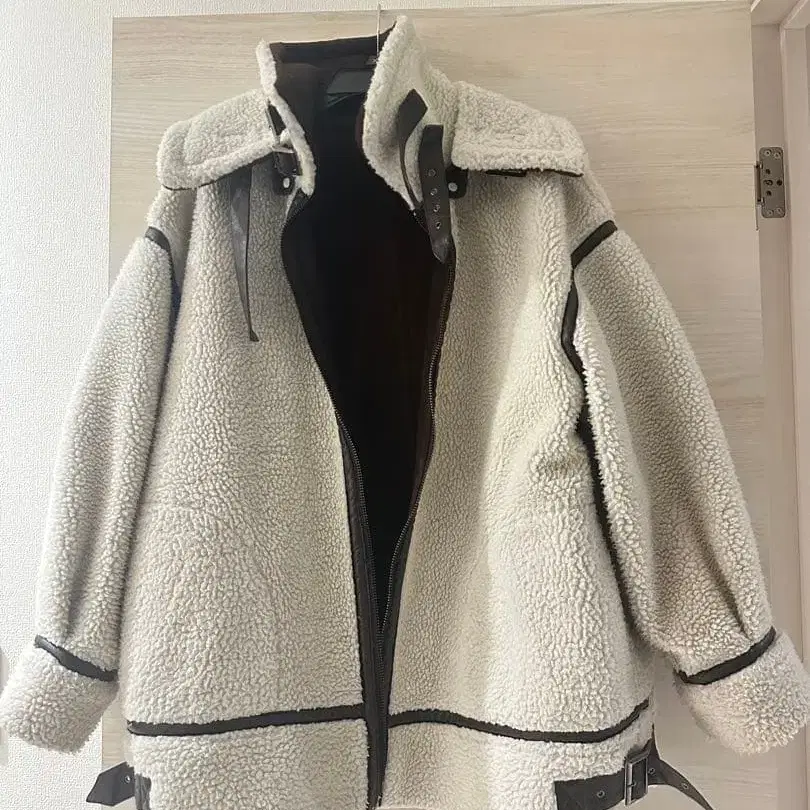 화이트와 브라운의 보아 자켓, 옷깃 벨트 포함으로 스타일리시합니다.
