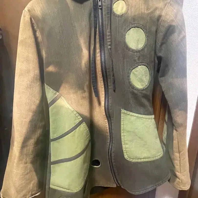 후드 부착 카키색 자켓, 유니크한 디자인과 사이드 구멍이 특징. - 색상: 카키 - 디자인: 후드 부착, 지퍼 개폐, 포켓 부착 - 특징: 사이드 구멍, 독특한 패턴 - 스타일: 캐주얼, 유니크한 디자인 방문해 주셔서 감사합니다. 하라주쿠에 있는 shury라는 셀렉샵에서 구매했습니다. 몇 번 착용했습니다. 속기모로 따뜻합니다. 개성 있는 스타일을 좋아했지만, 계통이 바뀌어 판매하게 되었습니다. 163cm에 딱 맞으며, 평소 M 사이즈를 입는 분도 괜찮을 것 같습니다. 즉시 구매 ⭕️ 색상 - 카키 계열