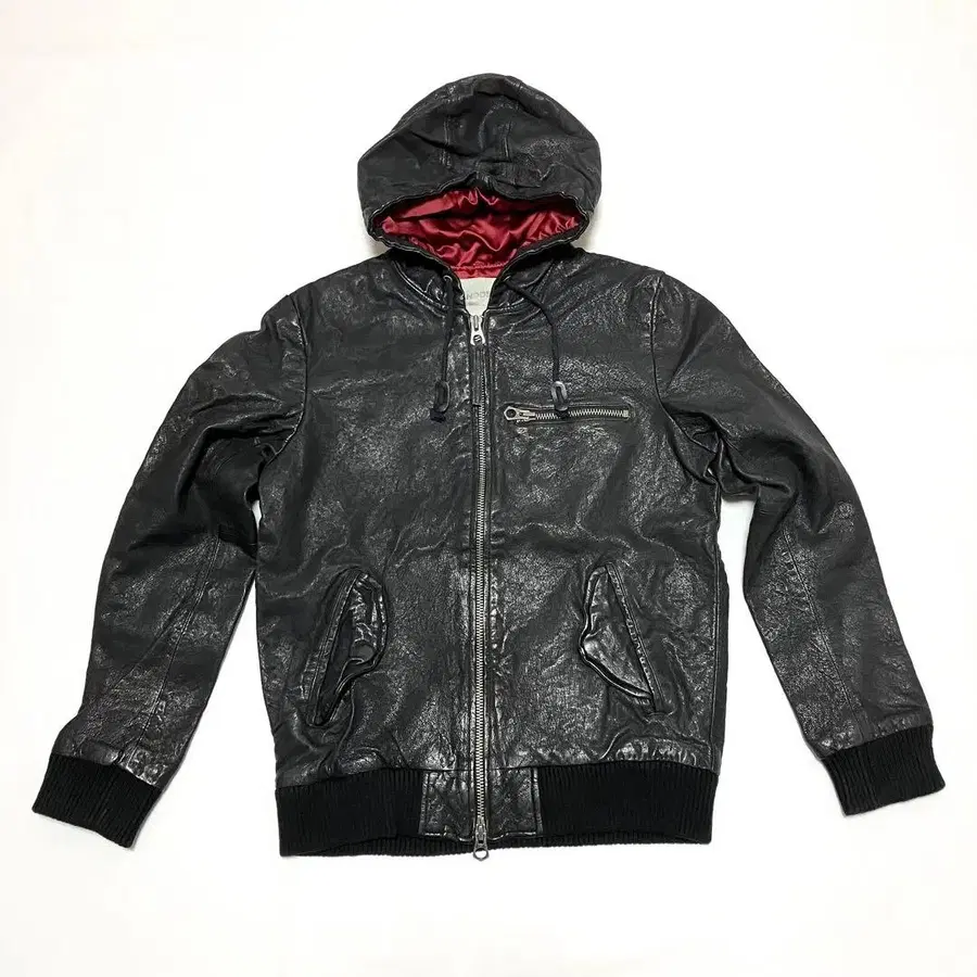 흔치 않은 후드 부착 레더 자켓입니다.