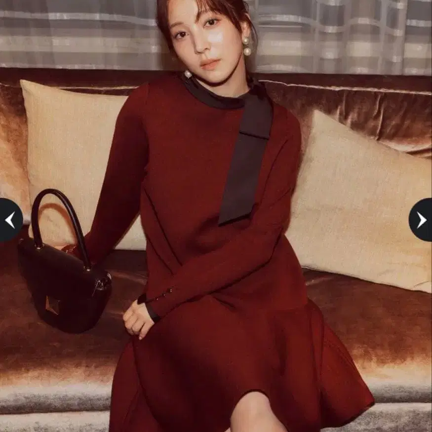 토코 펄 비쥬 장식 빅 리본 절개 리브 니트 원피스 보르도