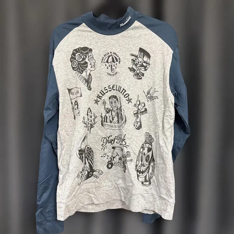 아이콘 올 패턴 프린트의 그레이와 네이비 모크넥 긴팔 셔츠. - 브랜드: Russeluno - 색상: 그레이/네이비 - 디자인: 타투풍 프린트 - 뒷면 디자인: 로고 프린트 - 옷깃 디자인: 모크넥 방문해 주셔서 감사합니다.