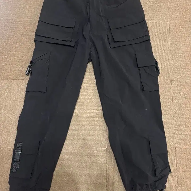 조정 가능한 허리와 6개의 포켓이 있는 블랙 카고 팬츠.