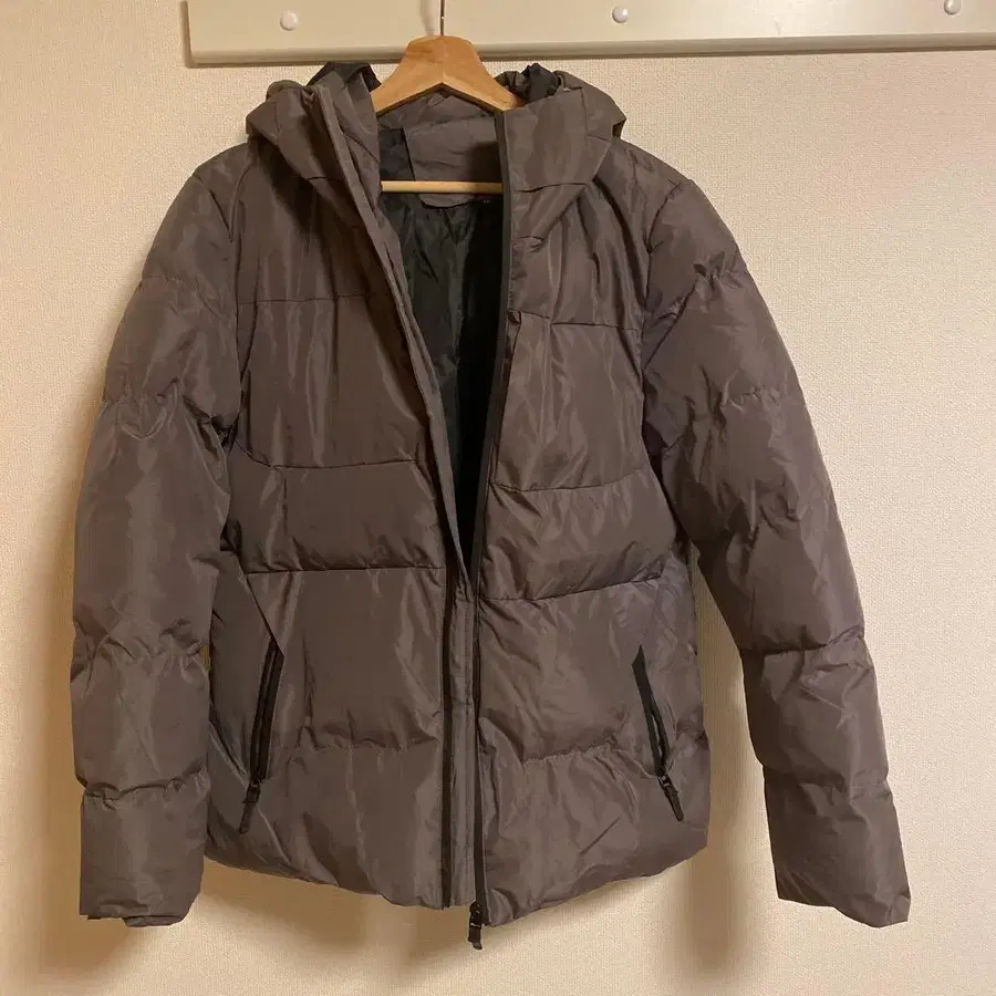 후드 부착 그레이 다운 자켓이며, 내부에 포켓이 있습니다. - 색상: 브라운 - 디자인: 다운 자켓 - 내부 포켓: 있음 방문해 주셔서 감사합니다. 평소 L 사이즈를 착용하는 제가 입었을 때 딱 맞는 느낌입니다. ⚠️ 택은 보이지 않으니 양해 부탁드립니다. 사이즈 - M