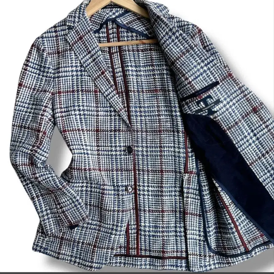 TAGLIATORE 딸리아또레 실크 블렌드 요철 소재 트위드 테일러드 자켓 남성용 48 L 사이즈 하운드투스 패턴 ○ 사이즈 표기 48 기장 약 71cm 가슴 너비 약 52cm 어깨 너비 약 43cm 소매 길이 약 58cm ○ 컬러 블루 하운드투스 패턴