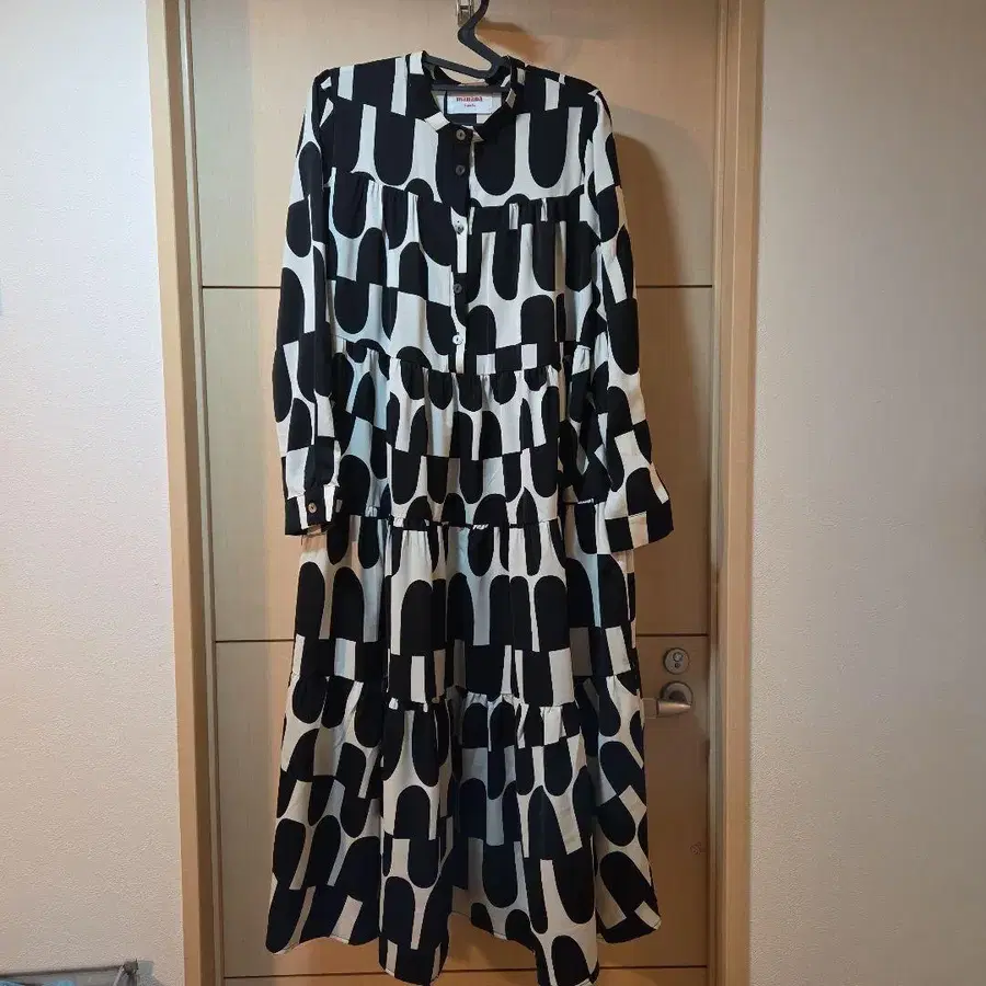 화이트와 블랙의 티어드 디자인 긴팔 셔츠 원피스. - 색상: 화이트와 블랙 패턴 - 디자인: 버튼 포함, 긴팔, 티어드 스타일 - 스타일: 셔츠 원피스, 롱 기장 방문해 주셔서 감사합니다.