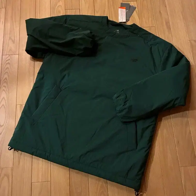 다크 그린 색상의 New Balance 긴팔 상의, 포켓이 있고 밑단 조절이 가능합니다.