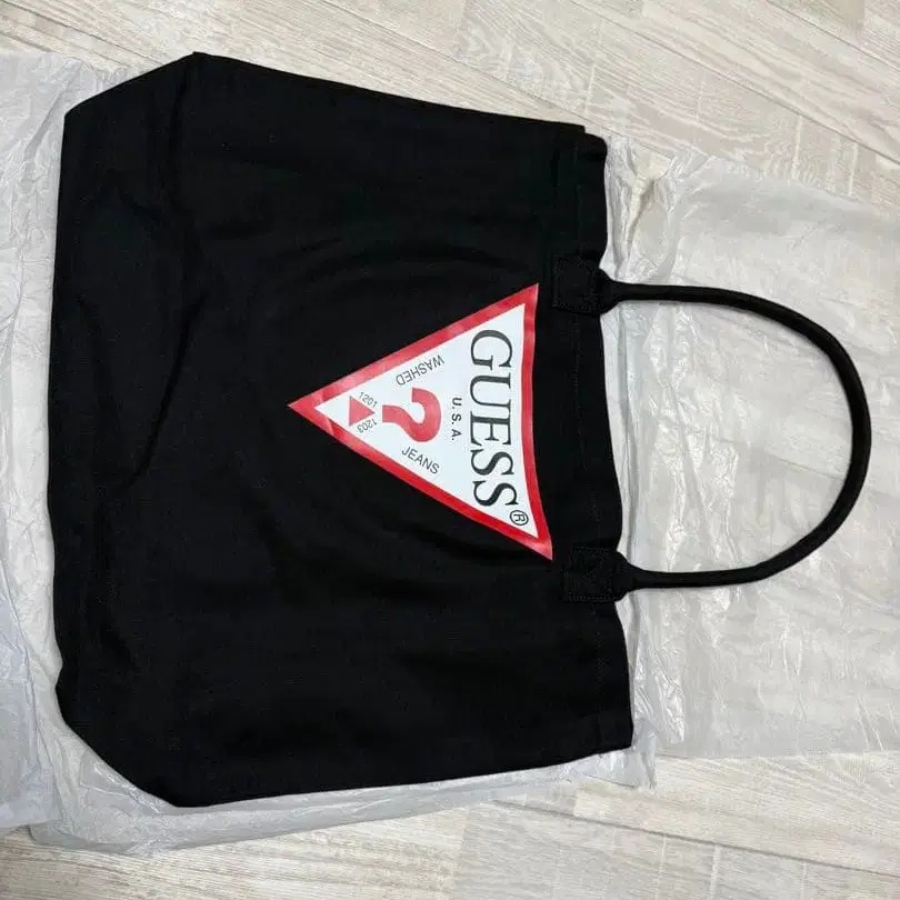 GUESS의 블랙 토트백, 삼각형 로고와 메시지 프린트 포함.