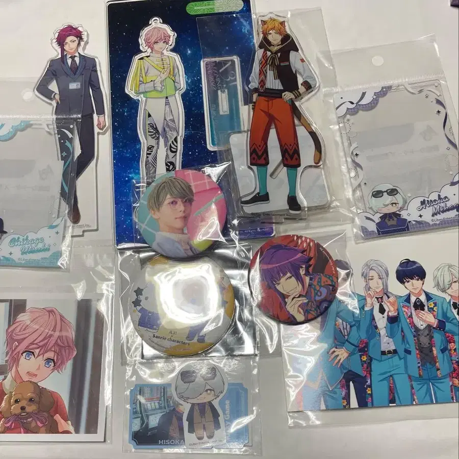 애니메이션 캐릭터의 아크릴 스탠드와 캔뱃지 세트.